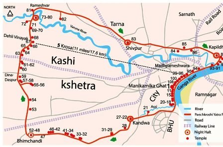 కర్దమేశ్వర్ (కందవా)… మొదటి రోజు బస. ఇక్కడ పురాతన శివాలయం ఉంది. భీమచండి.రెండో రోజు బస. ఇక్కడ భీమచండీ దేవి ఆలయం ఉంటుంది. రామేశ్వర్… మూడో రోజు బస. వరుణ నది ఒడ్డున ఉంటుంది. శివపూర్.. నాలుగో రోజు బస. ఇక్కడ పాండవుల పేరిట పంచ లింగాలు ఉంటాయి. కపిలధార ..ఐదో రోజు బస. ఇక్కడ పితృ తర్పణాలు కూడా వదులుతారు.