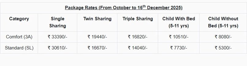 ఇతర వివరాలకు ఐఆర్సీటీసీ టూరిజమ్ అధికారిక వెబ్ సైట్ చూడండి.