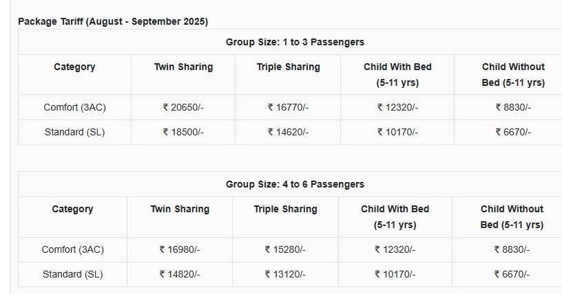 ఈ టూర్ మొత్తం 4 రాత్రులు, 5 పగళ్లు కొనసాగుతుంది. కాచిగూడలో ప్రతి గురువారం సాయంత్రం 5 గంటలకు రైలు ప్రారంభమవుతుంది. సెప్టెంబర్ 25 వరకు ప్రయాణానికి టిక్కెట్లు అందుబాటులో ఉన్నాయి.